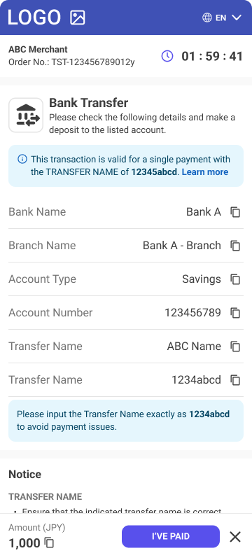 • Description - Payment method which requires customer to copy Payment instructions from the Payment application or our API response and create the Payment transfer using the instructions within customer’s own payment service such as Internet or mobile banking or wallet. As the Payment relies on the customer offline Payment transfer processing it can take minutes for Payment to be confirmed and also Payment expiration ratio can be higher. For payments in VND and LAK currencies customer can simply scan displayed QR code instead of copying Payment instructions.