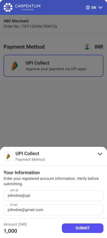 • Description - UPI Collect is a method of fund transfers in India. This payment method allows users to simply authorize payments through their registered UPI app after receiving a payment collection request.